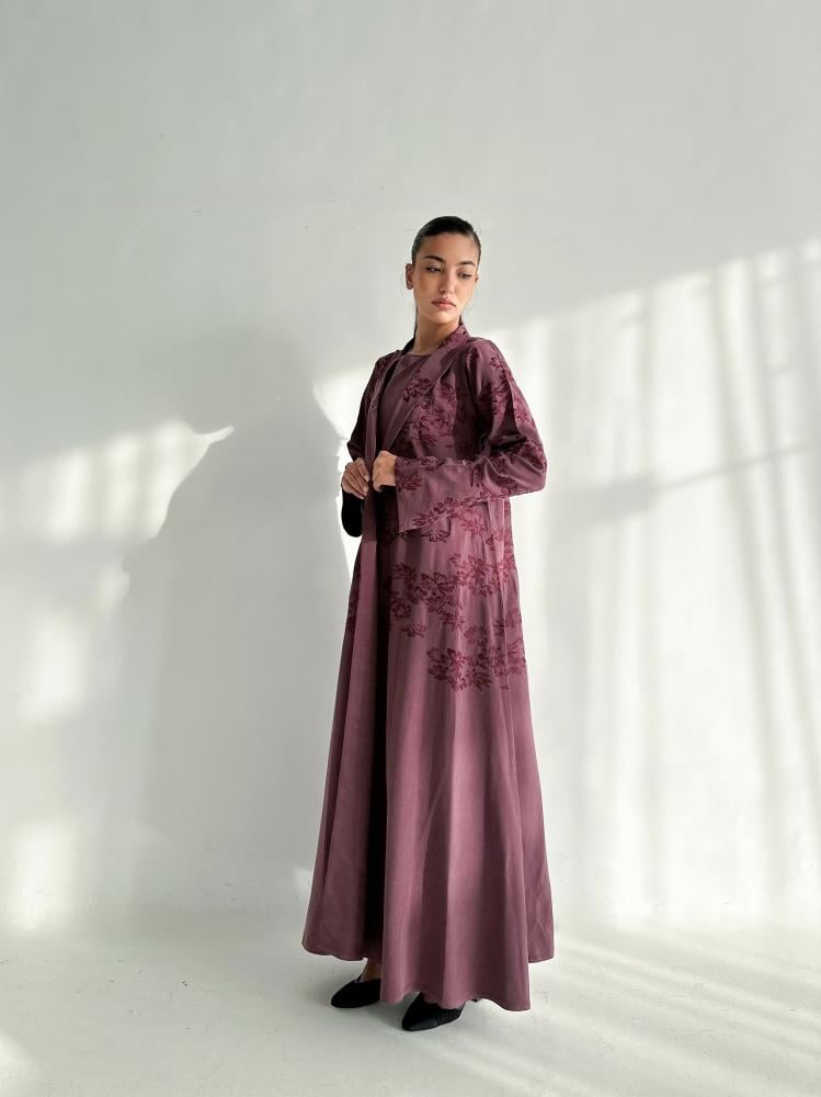 عباية صيفية من اللينن الياباني المغسول بتطريز لِجسي الخاص ، تتميز بقصة الكلوش الأنيقة وأكمام واسعة