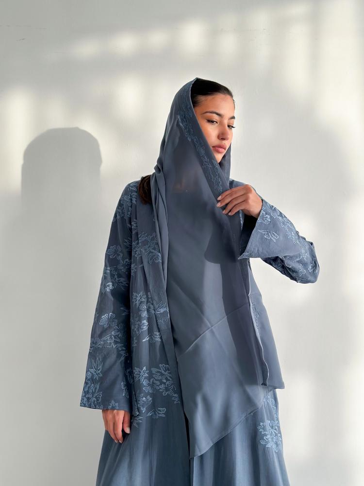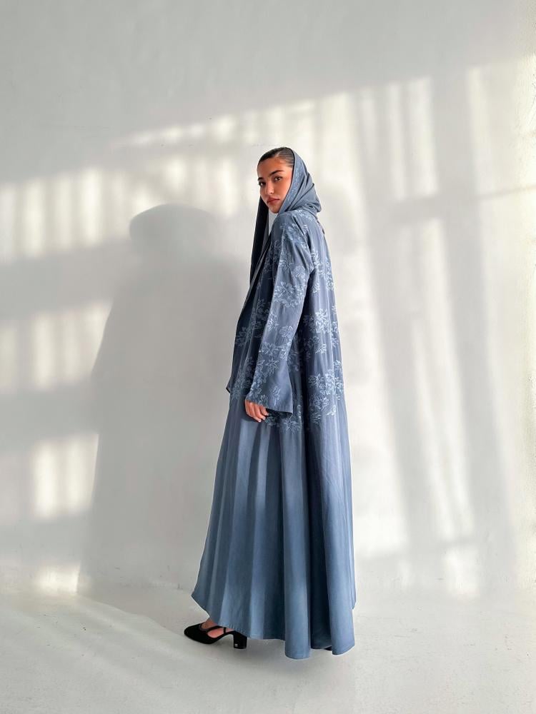 العبايات الصيفيةعباية صيفية من اللينن الياباني المغسول بتطريز لِجسي الخاص ، تتميز بقصة الكلوش الأنيقة وأكمام واسعة