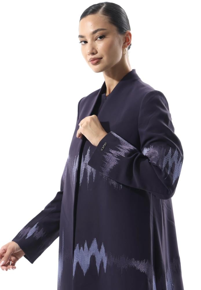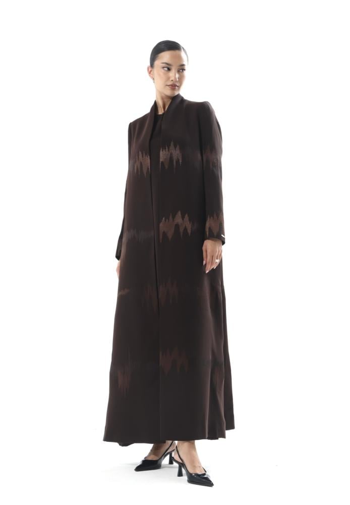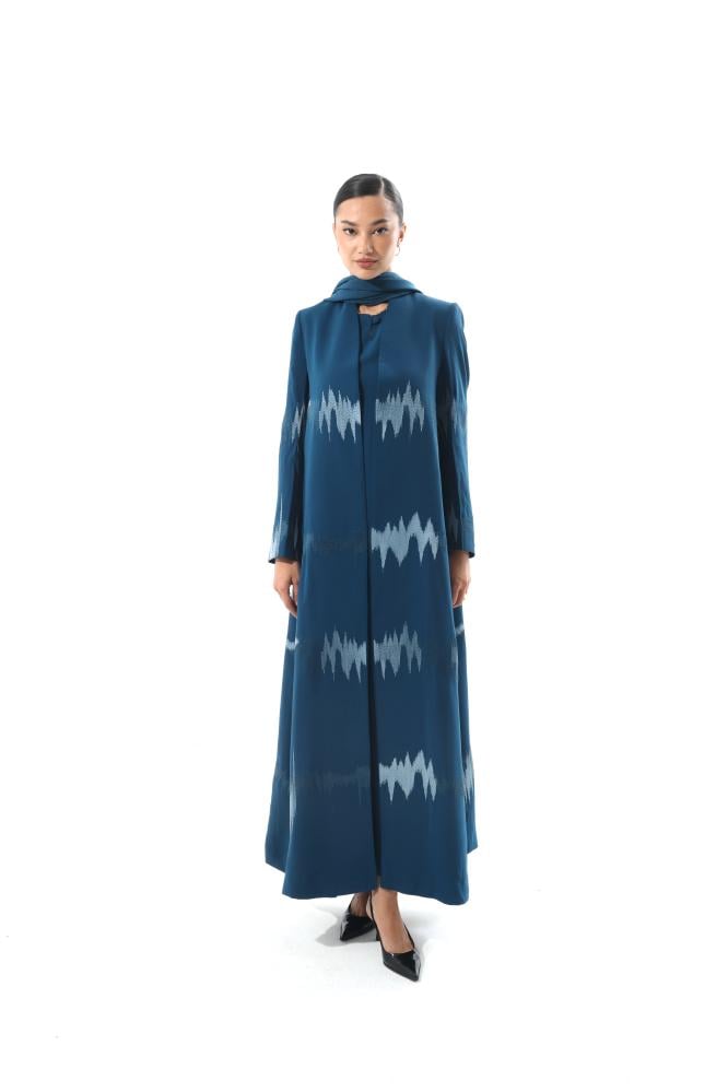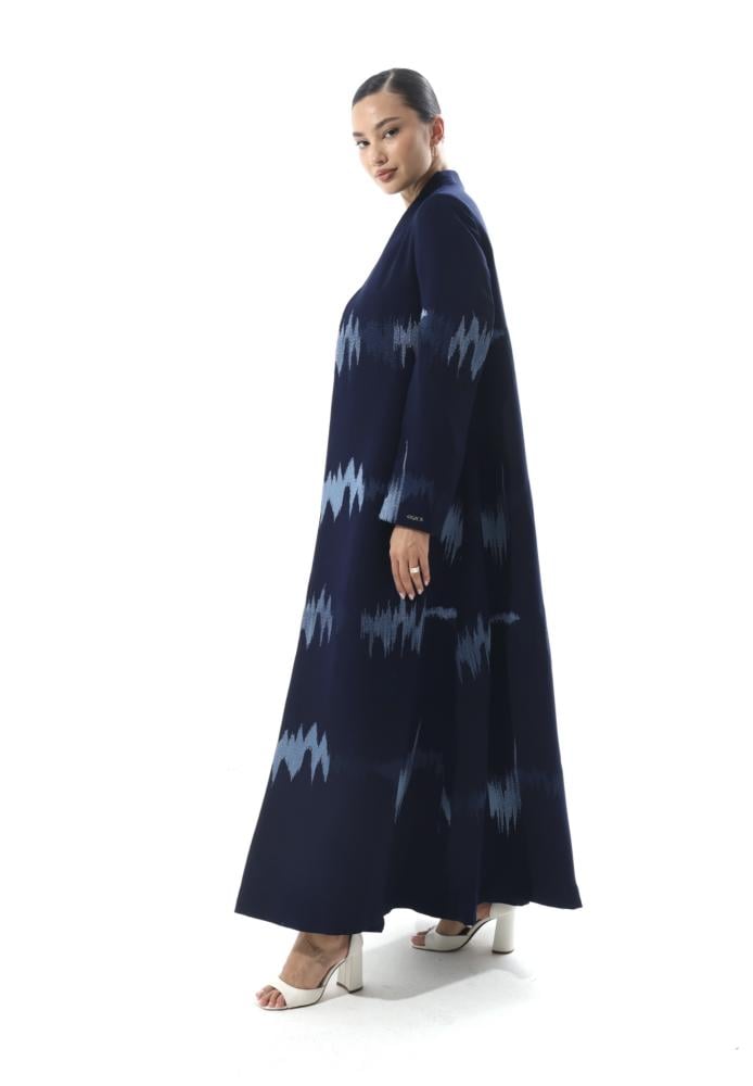 عباية Wave Pattern بقصّة بليزر أنيقة تجمع بين الانسيابية والفخامة، تتميز بتطريز مستوحى من حركة الأمواج بدرجات ألوان متناغمة بين الداكن والفاتح، مع فستان انسيابي يكمل الإطلالة برقي.